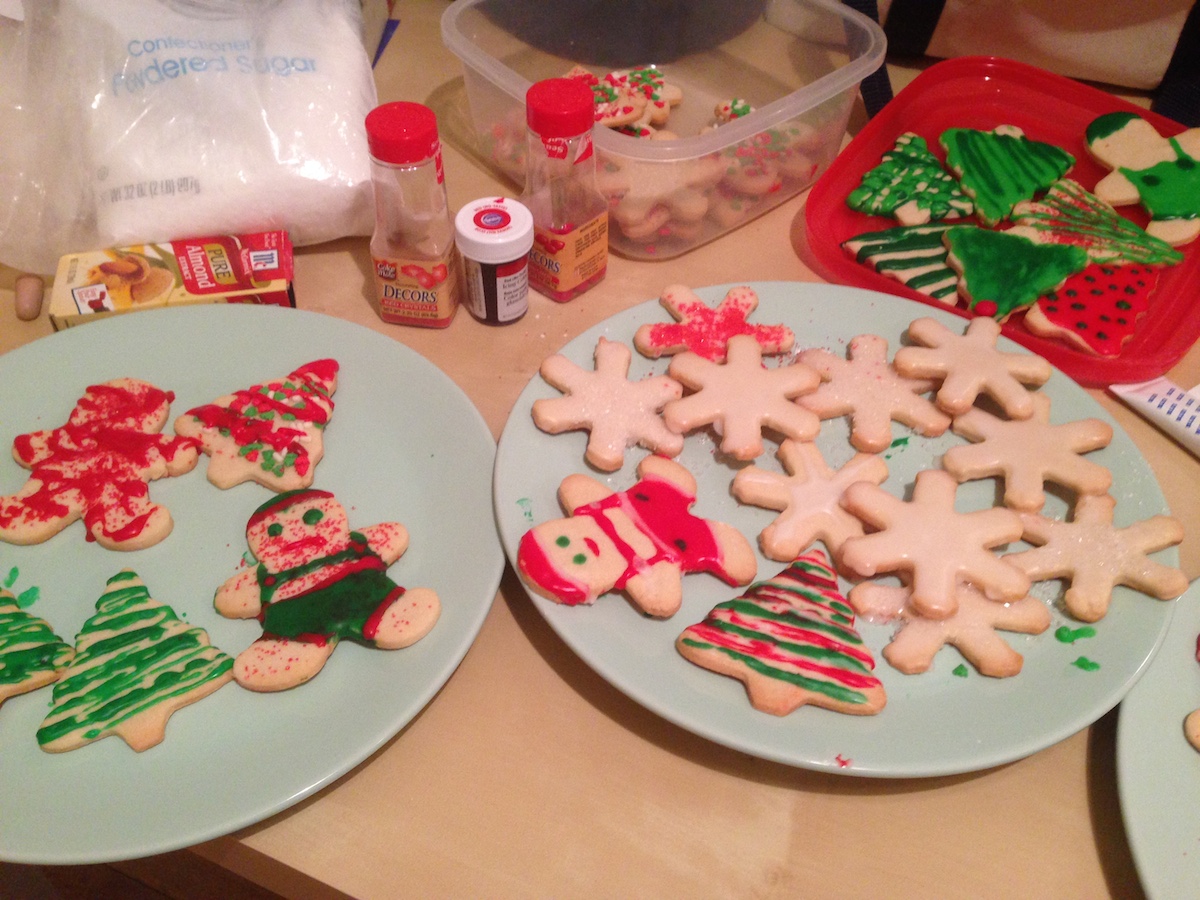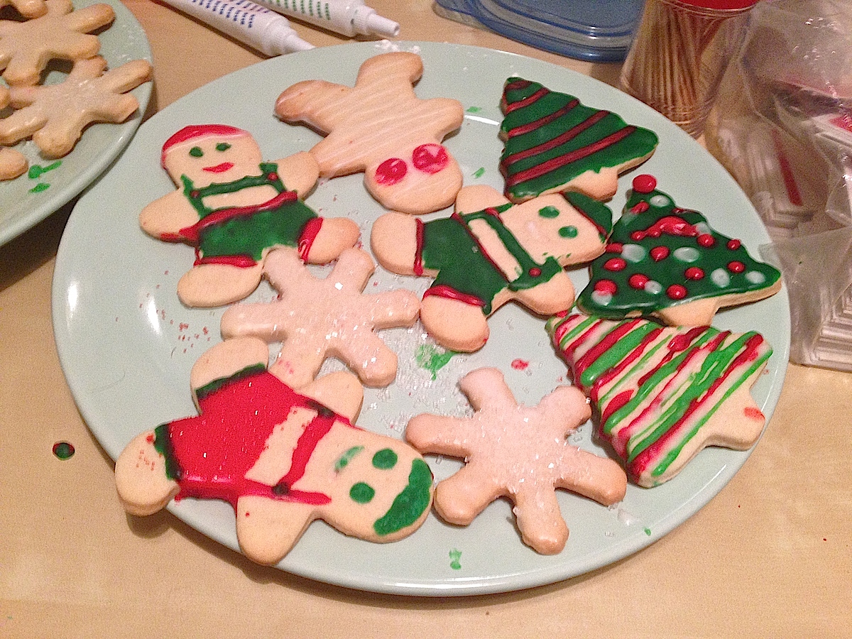 My mom and I make Christmas cookies every year. My brother and dad help by stealing extra dough and adding gobs of sugar/icing to the decorations.