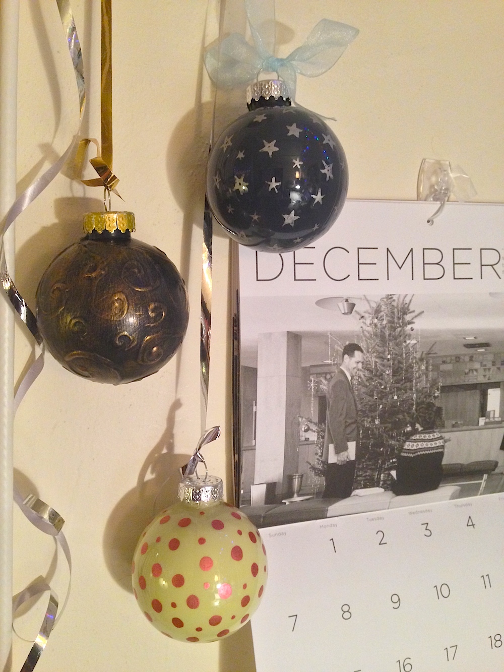 These are just cheap plastic ornaments. The green with dots and navy with stars were filled with watered down craft paint and then drained (so the paint doesn't flake and they are shiny. The decorations are pained on with sharpie metallic markers. The other ball was first decorated with fabric paint swirls. After those dried (>24 hrs), I painted over the whole thing with navy craft paint, and then dry brushed some gold highlights. I also colored the topper using gold paint pen. I'm not sure how well these will hold up, since the plastic probably doesn't hold the paint to well. But for now they are working!