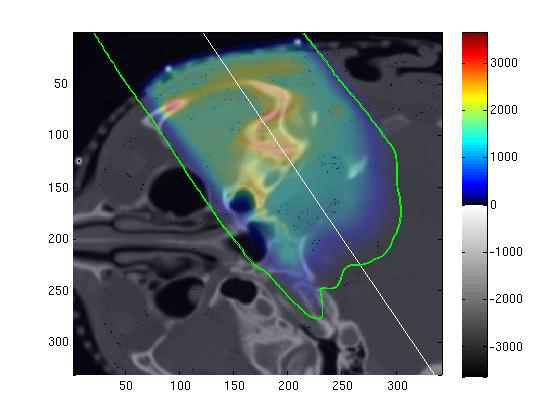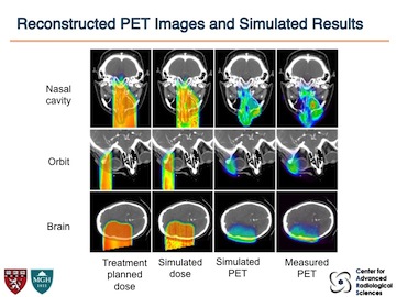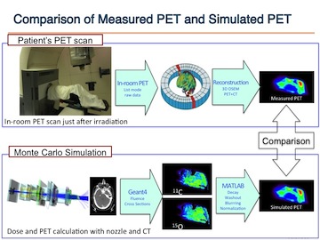 I was contributing to the development of a novel approach for adaptive Positron Emission Tomography (PET) monitoring of Proton Beam Therapy using endogenously generated positrons. It is important, but difficult, to verify the delivery of dose for proton therapy, and PET is currently the best option for monitoring dose delivery in vivo. As they pass through matter, therapeutic protons create positron-emitting radionuclides that can be imaged with a PET camera. The radionuclides arise through different physics mechanisms than the dose and are thus not directly relatable. We are investigating methods for relating the PET images to planned dose and assessing the accuracy of the treatment.
